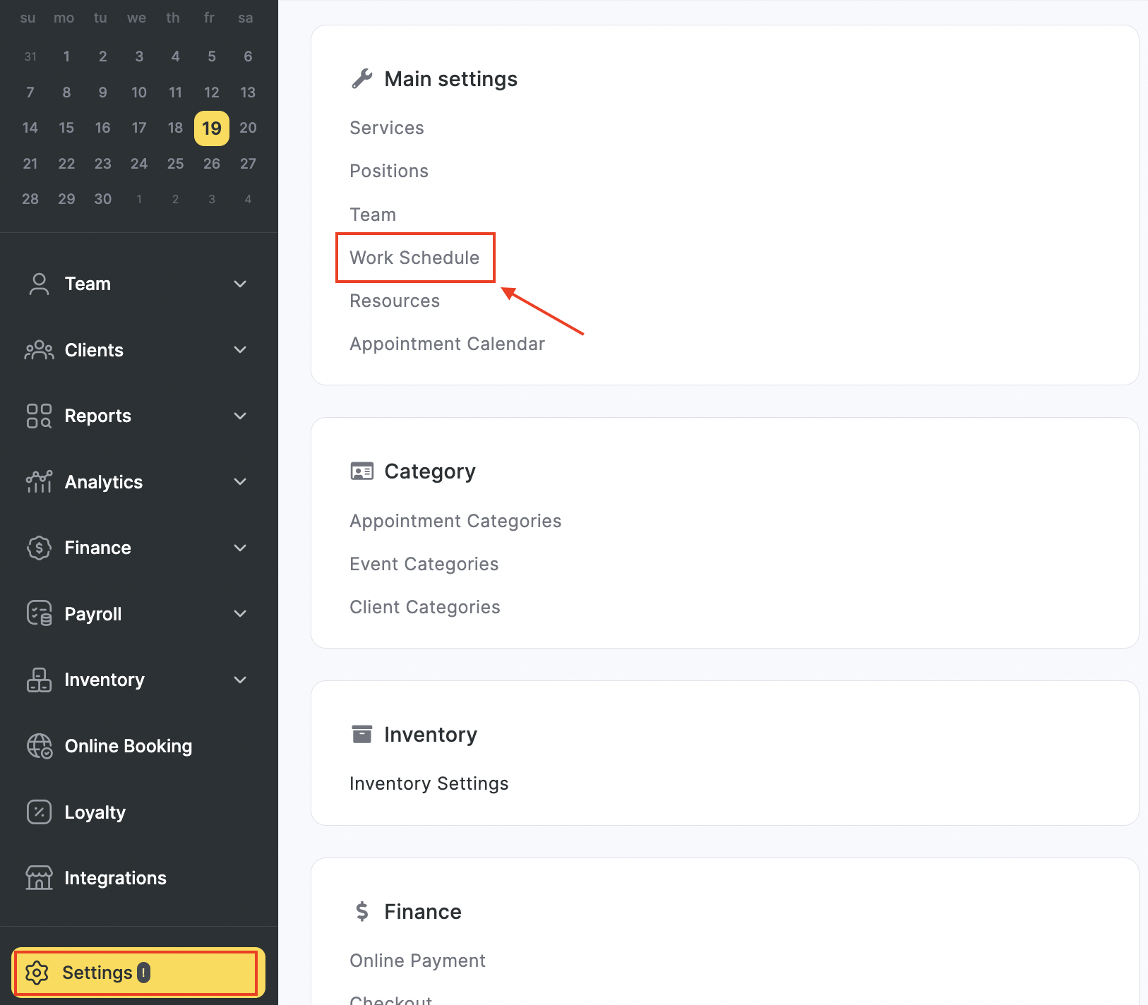 1. Go to “Settings” > “Main settings” > “Work Schedule” section.