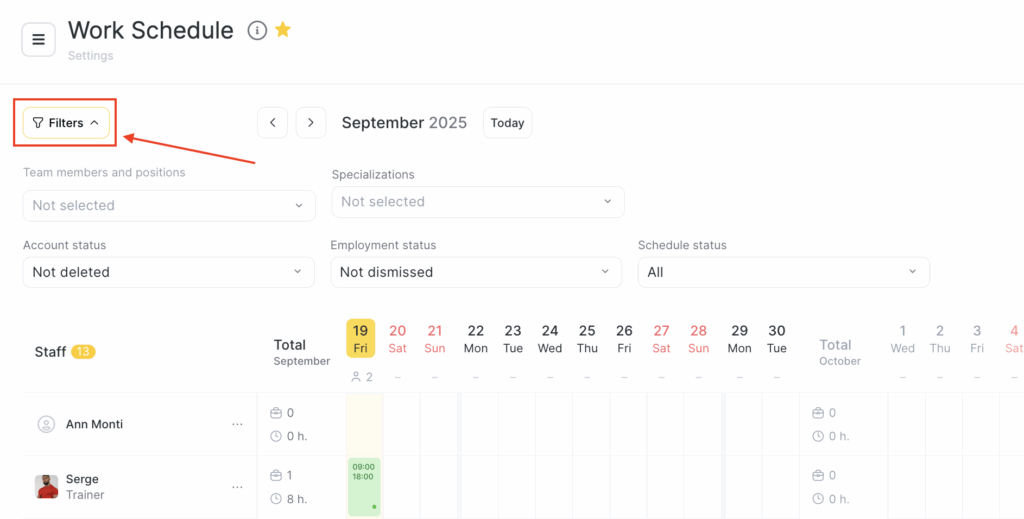 2. Before setting the schedule, you can refine your team member selection based on their positions, if it’s deemed necessary for your planning process. To do this, click on the “Filters” button, where you can then choose one or more desired team member positions by checking the boxes.