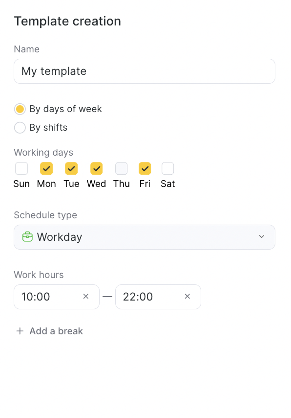 4. Your own template: Craft a personalized template to suit your unique needs by simply clicking on “Create a template.” From there, you can define the template’s name and designate the working days, mirroring the flexibility offered by the templates designed for both days of the week and shifts.