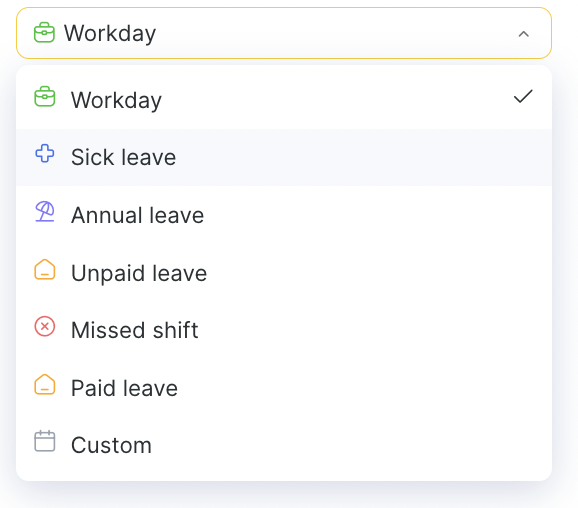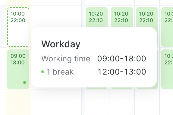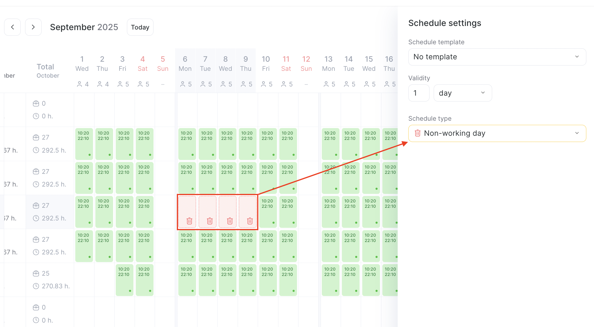 For non-working days, the “Working hours” setting is not applicable; the other schedule types are designed for non-working days. In the configured schedule, the selected type will be color-coded according to your initial selection during setup.