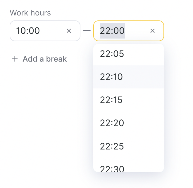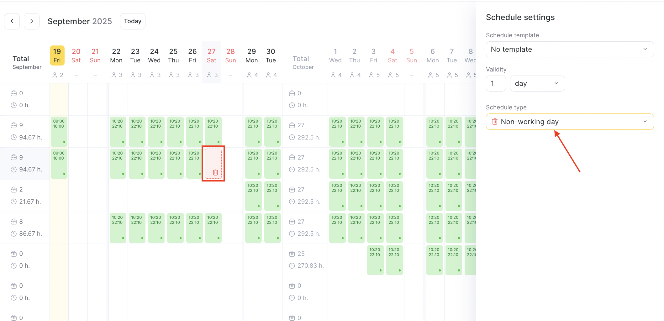1. When you add a schedule and subsequently edit it, an additional type, “Non-working day,” becomes available. You can find more details about this option in the section titled “How to delete a work schedule” below.