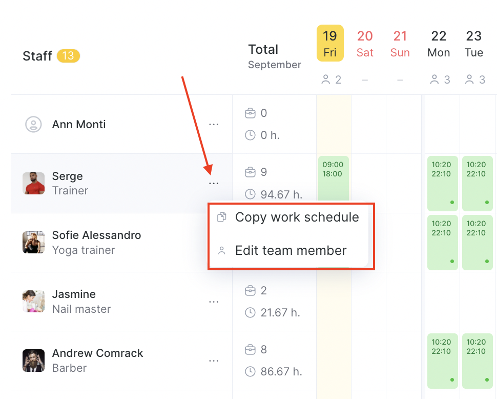 If multiple team members follow the same schedule, you can efficiently set up a schedule for one team member and duplicate it for others. Here’s how to do it: