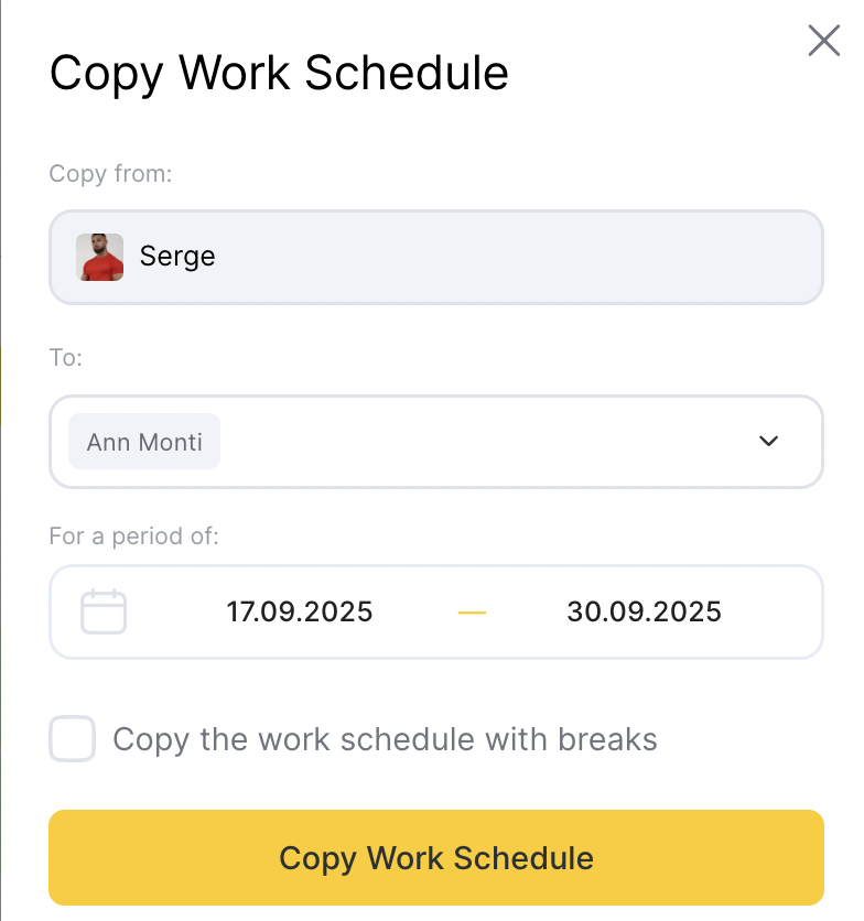 5. If the copied schedule includes identical breaks, you can expedite the process by checking the “Copy the work schedule with breaks” checkbox. However, if the breaks differ for each team member, leave this option unchecked. In such cases, you will need to manually add breaks for each team member after copying the schedule.