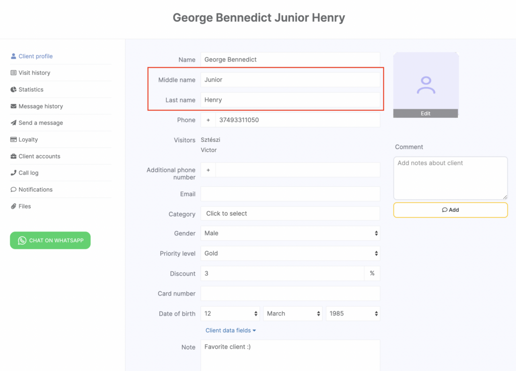 In certain cases, simply providing the client’s name may not be sufficient. For instance, when filling out medical or other documents, or when attempting to simplify searches within the client database for individuals with similar names. By specifying the client’s full name in the designated field, it will be displayed in notifications to the client, reviews in the online booking widget, and the Altegio interface for all team members.