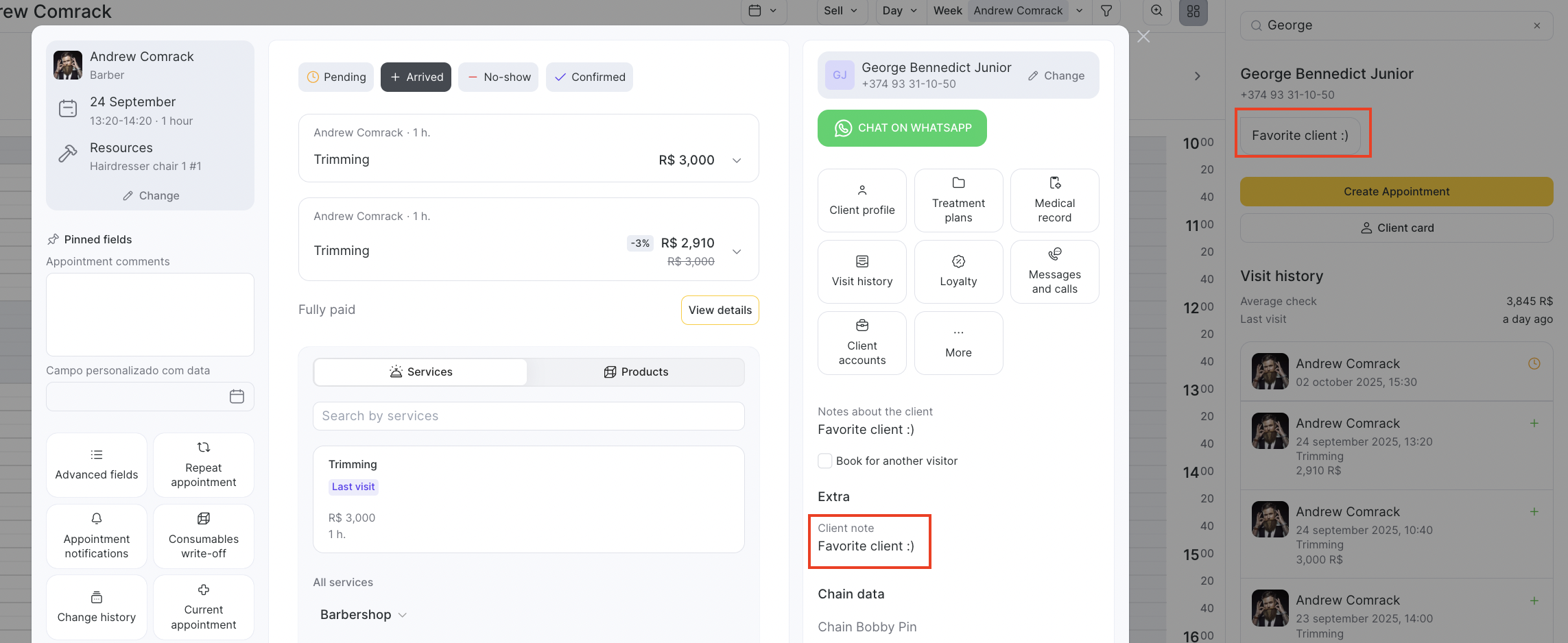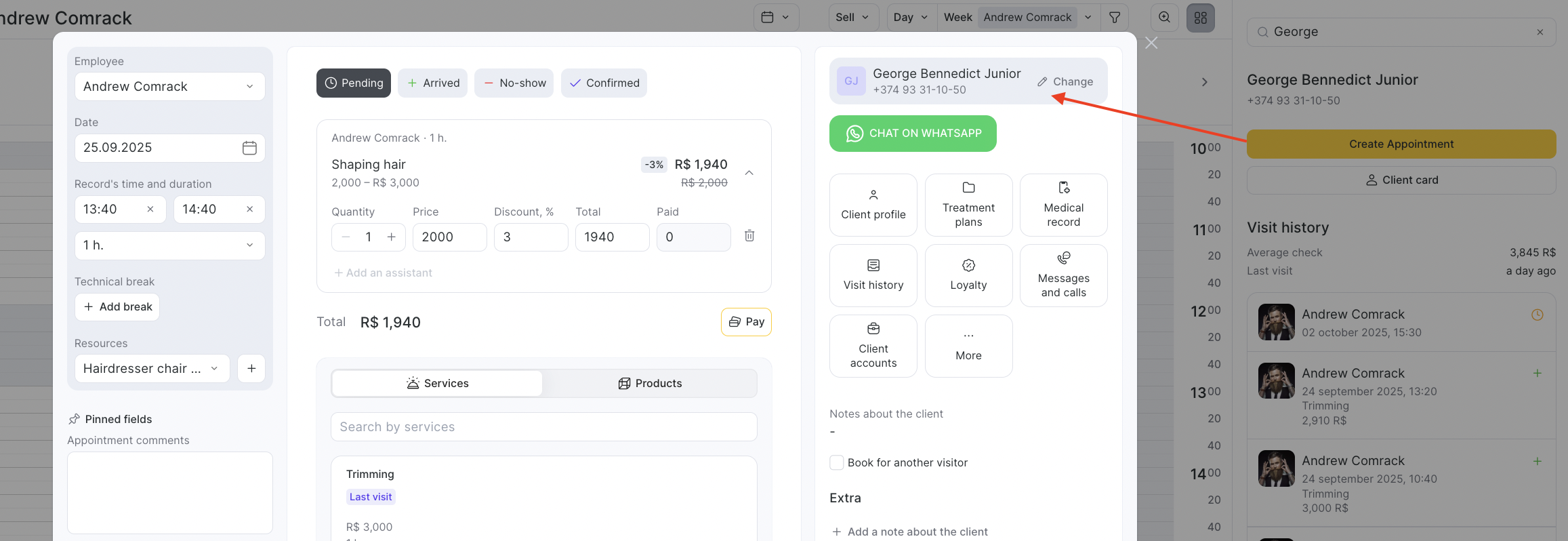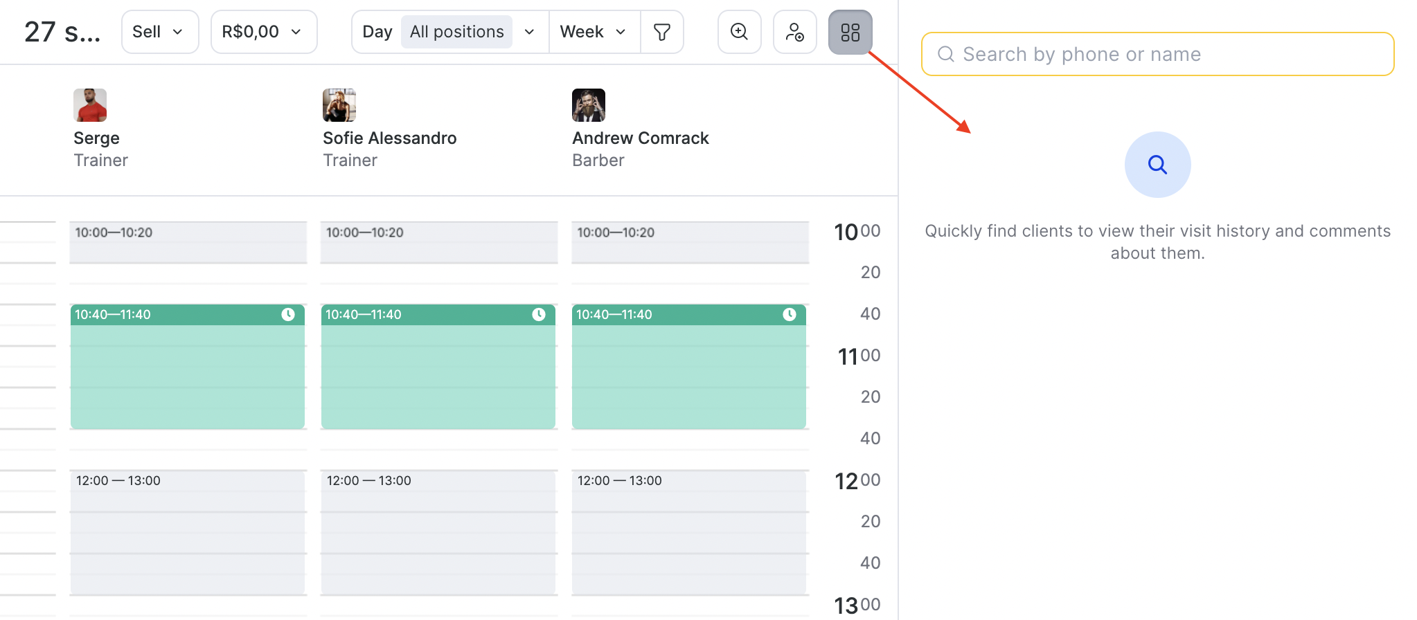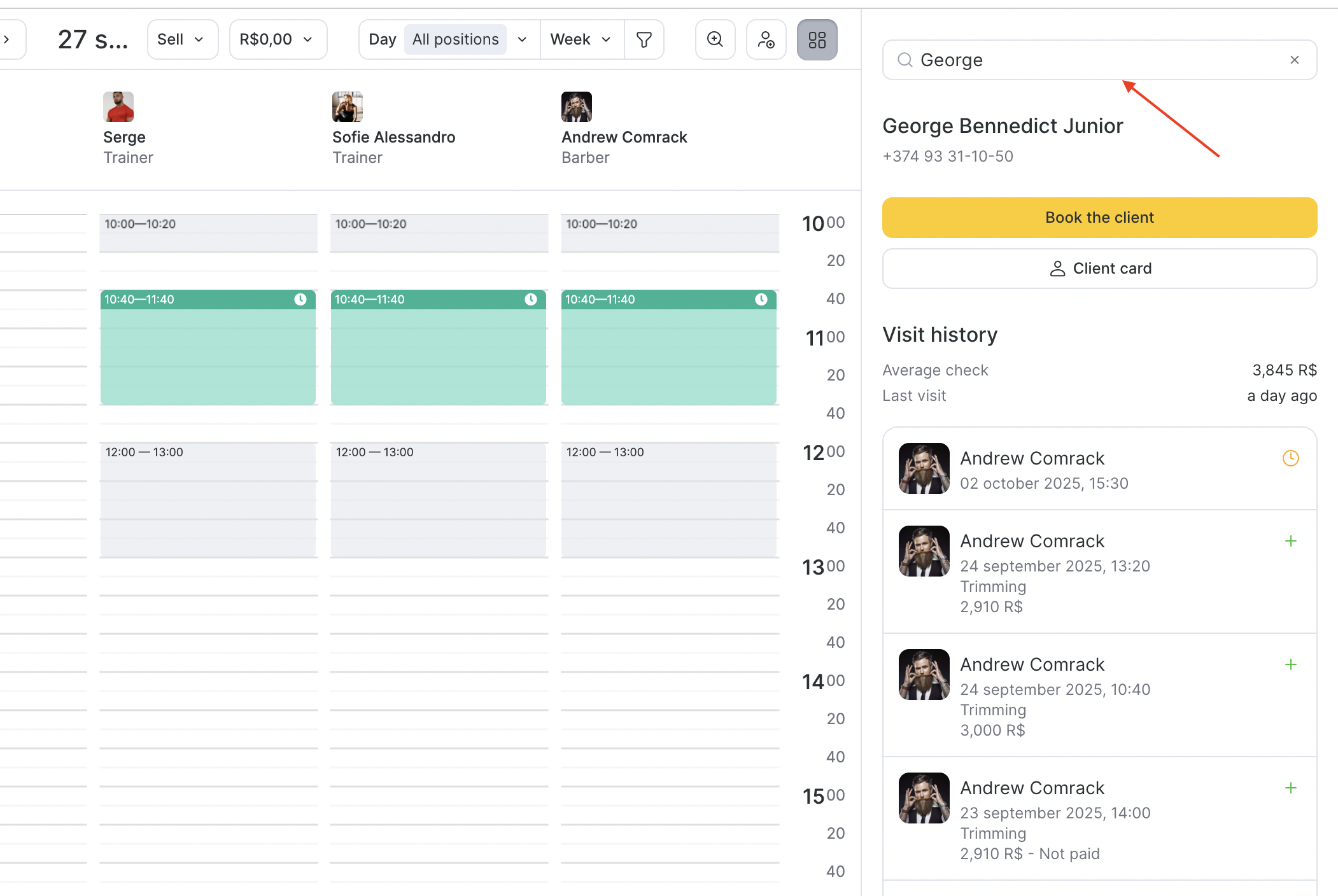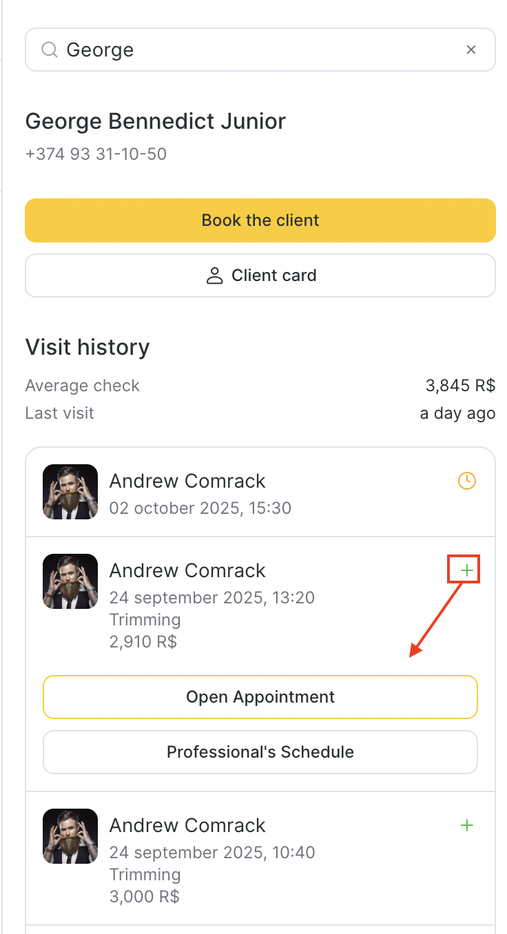 The search panel will display the client’s recent appointments, professionals they were booked with, services they received, paid amounts, and locations they visited.Important