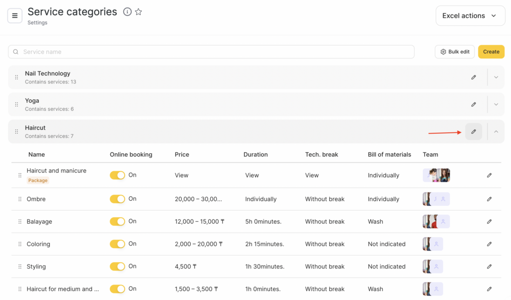 - On the page that opens, click the service name or the pencil icon to open the settings.