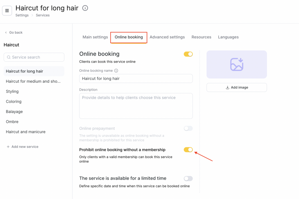If your branch has mandatory or optional payment enabled for individual services, when configuring the service you must choose either online prepayment or restrict online booking without a membership — you can’t enable both at the same time.