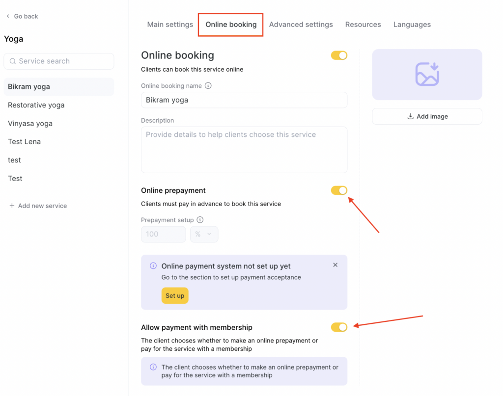 That means for individual services you can enable only one option: prepayment or membership booking (not both). For group services (events), you can enable both options at the same time.
