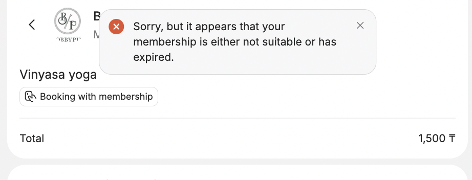 - If the client tries to book a service they don’t have a membership for, they will see: “Sorry, but it appears that your membership is either not suitable or has expired.”