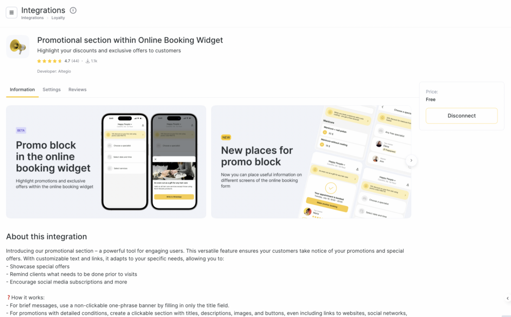 The “Promo block” integration, offered by Altegio, is a powerful and versatile tool designed to enhance your communication with customers. Whether you’re looking to promote special offers, provide reminders, or encourage social media engagement, this tool allows you to capture your audience’s attention effectively.