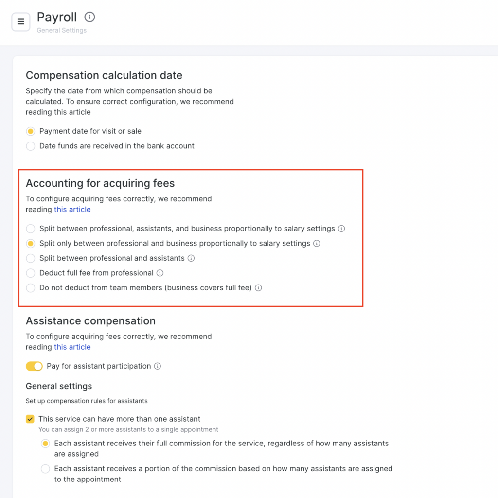 - In the Accounting for acquiring fees section, configure who covers the acquiring fee when an appointment is paid and how it is distributed in team member payroll calculations.