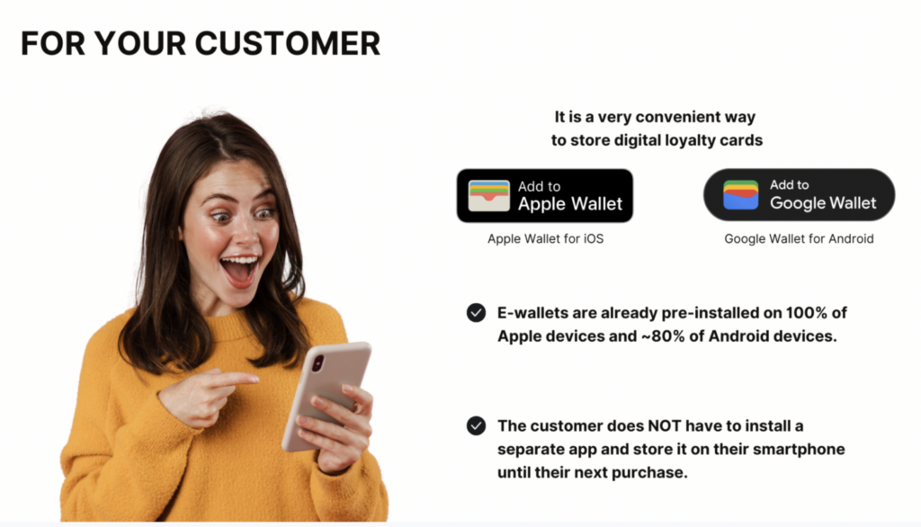 Admins only need a QR code at the reception. They ask customers to scan it, enter their phone number, and add the card to their Apple or Google wallet. It’s that simple!