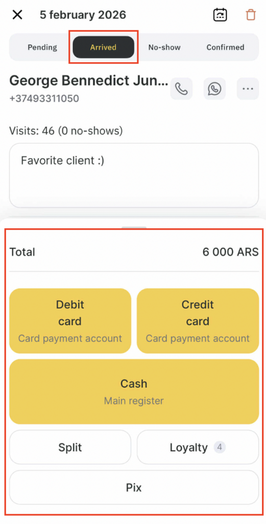 When a client visit is marked with the status “Arrived”, a payment modal becomes available at the bottom of the visit screen.