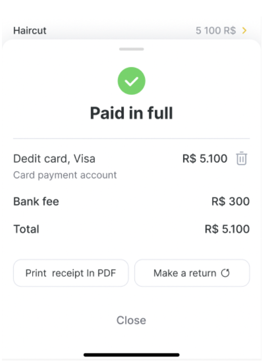 After payment, the screen will show a green checkmark and “Paid in full” status. The receipt summary includes: