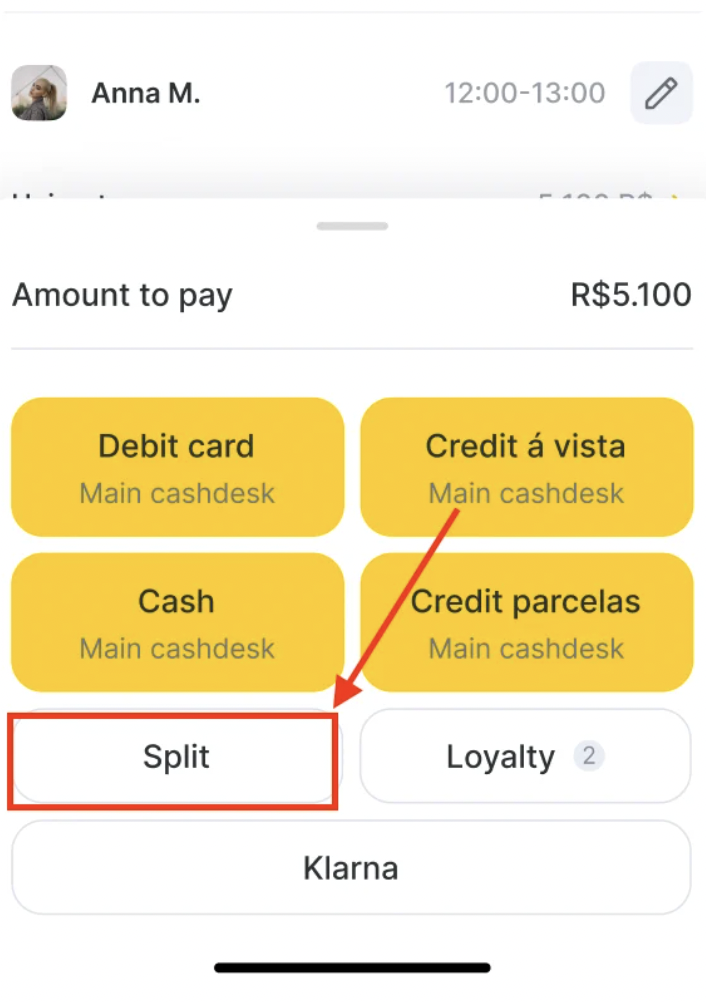 - To divide payment between two or more methods tap Split in the payment modal.
