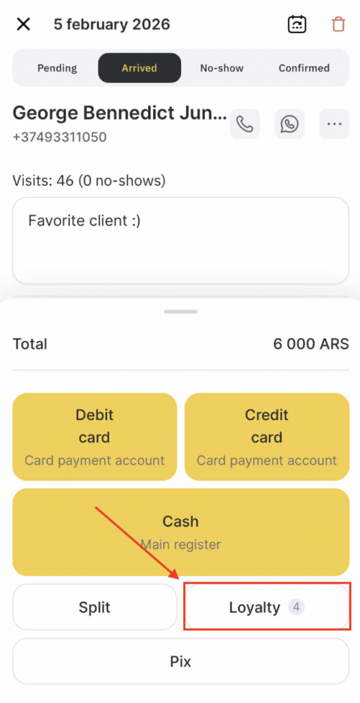 If your client has loyalty points available, the Loyalty button will indicate the number of available redemptions or Client personal accounts (e.g., “2”). Tapping it allows you to apply them toward the total payment.