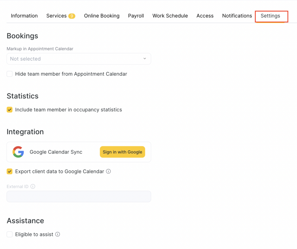 The Settings tab in the Team section provides advanced options for each team member. Here you can manage how the team member appears in the Appointment Calendar, track statistics, and connect their profile with external tools such as Google Calendar.