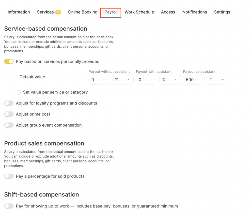 The Payroll tab allows you to set up how each team member is compensated for their work. This is where you define which types of payments or commissions apply to a specific team member, from service-based earnings to product sales and shift-based pay.