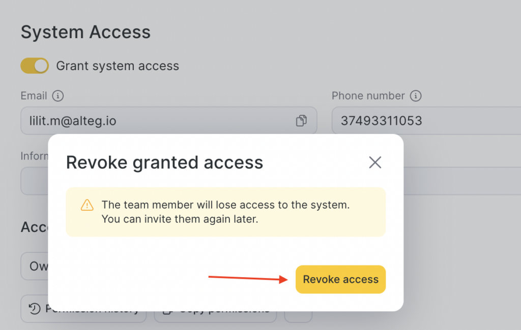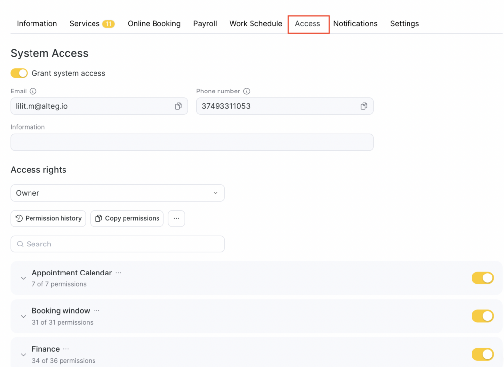 The Access tab allows you to define what each team member can do inside Altegio. This is where you assign roles and permissions to team members. The access level you choose also affects whether the team member counts toward your Altegio subscription billing.