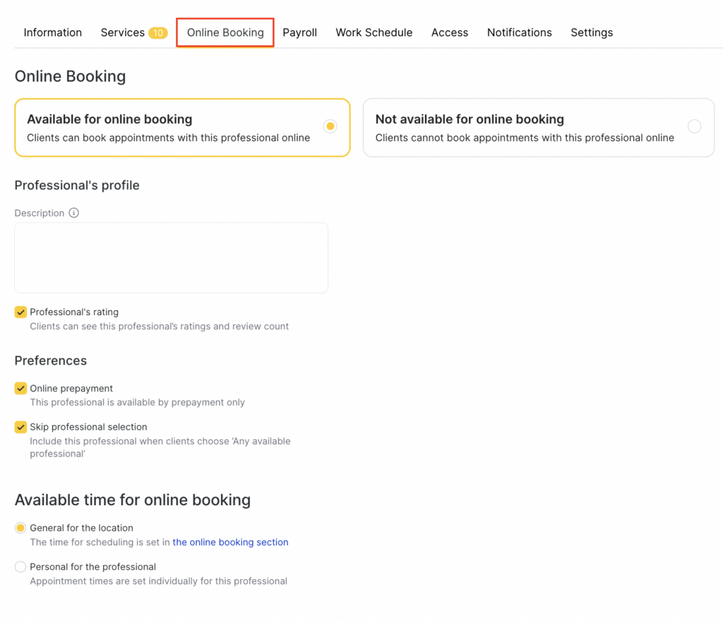 Enable or disable online booking: Choose whether clients can book this professional online or not.