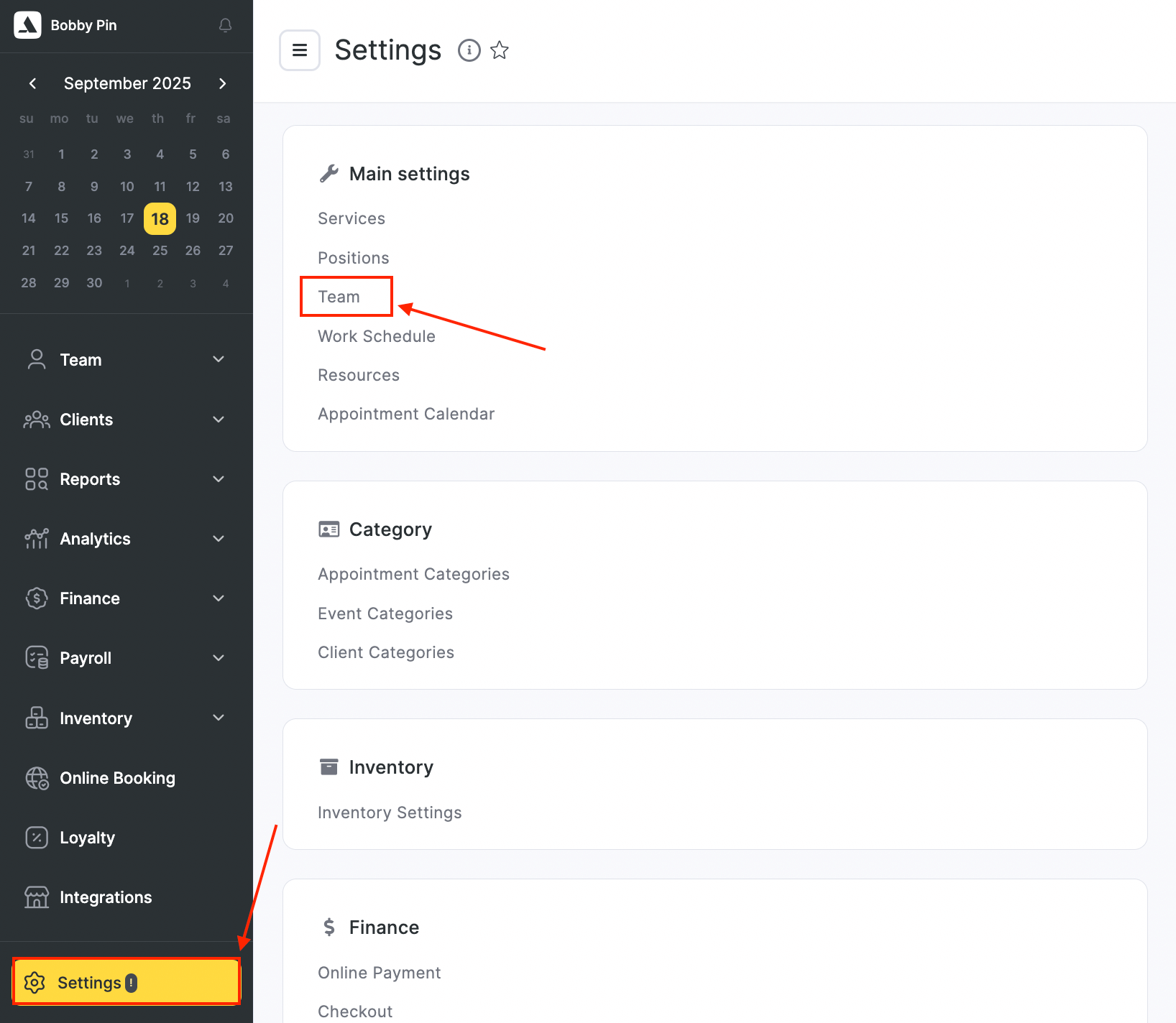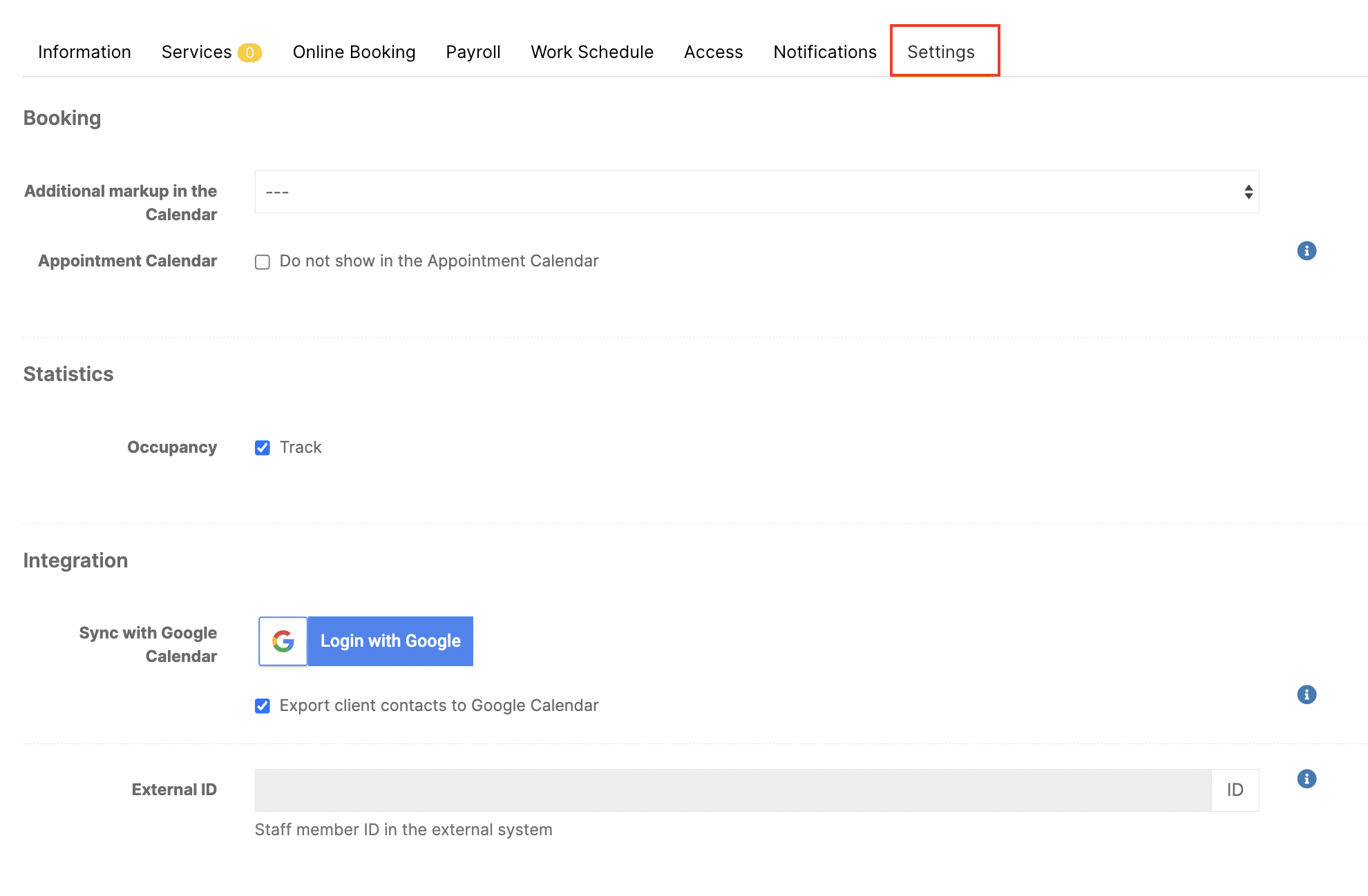 - Online Booking – Settings related to the team member’s visibility and booking rules in the online booking widget.