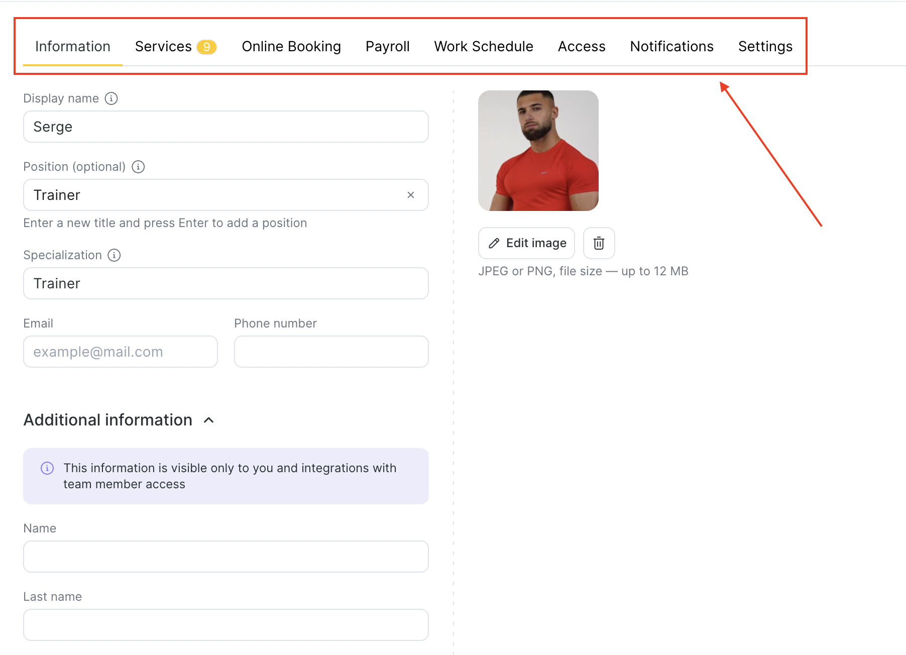 Profile Photo: Upload or edit the team member’s photo to appear in the booking system and internal lists.