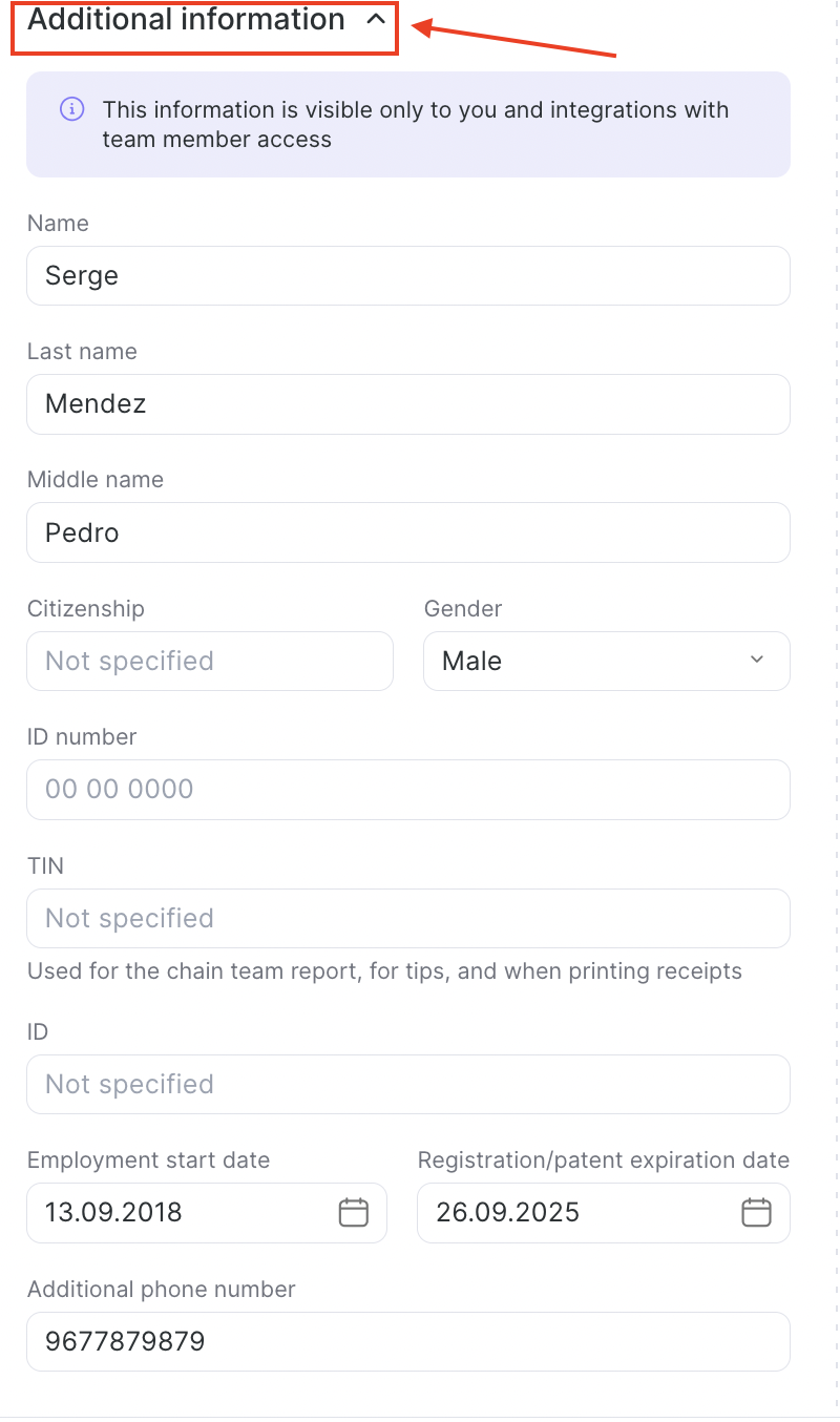 The Information tab in the Team section is where you store and manage all the essential details about each team member. This tab acts as the team member’s profile card — it’s the first place to visit when you want to view or update their personal and professional information.