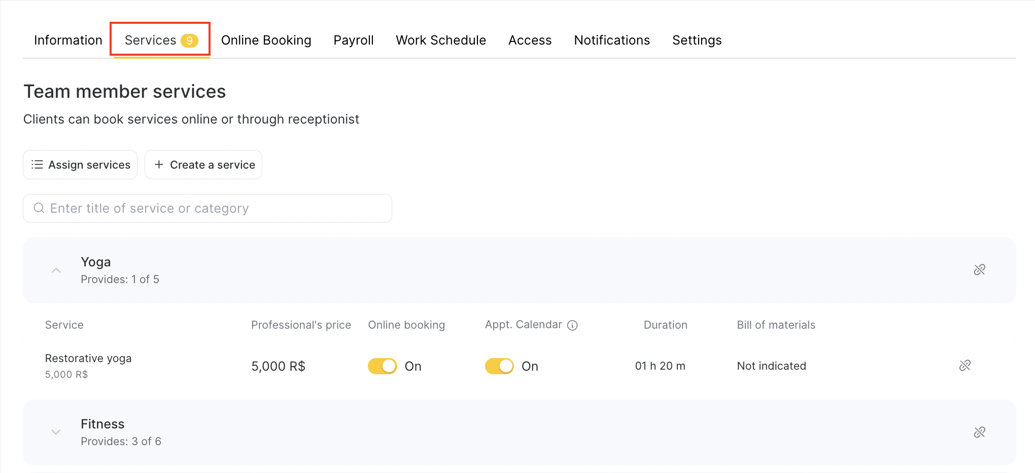 Assign Existing Services: Choose from your list of services to add them to the selected team member.