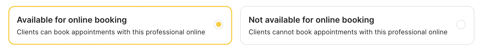 Enable or Disable Online Booking: Choose whether clients can book this professional online or not.