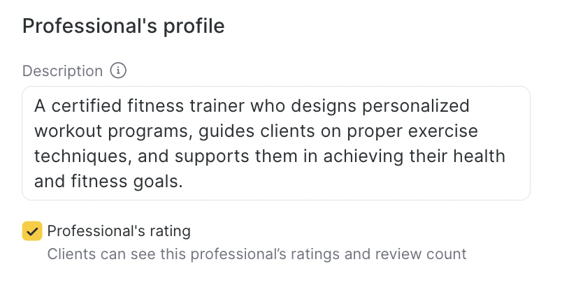 Professional’s Profile: Add a description that clients will see when booking online and optionally display ratings and reviews.