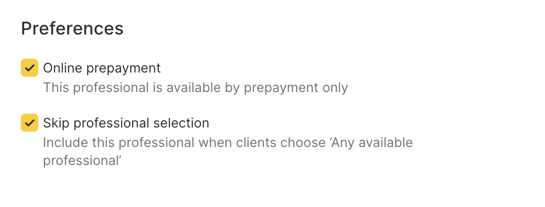 - Skip Professional Selection: Include or exclude the team member when clients select “Any available professional.”
