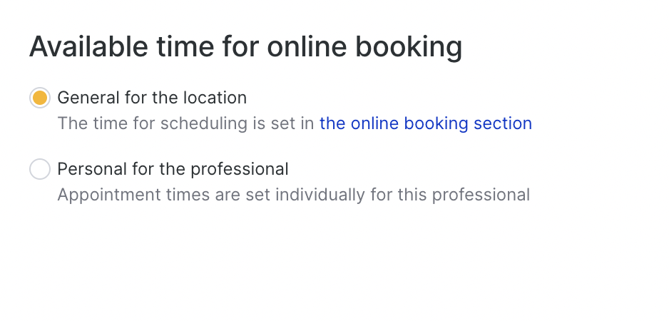 The Online Booking tab controls how clients can book appointments with a specific team member. This is where you decide if and how the professional appears in your online booking widget and what conditions apply to their online appointments.