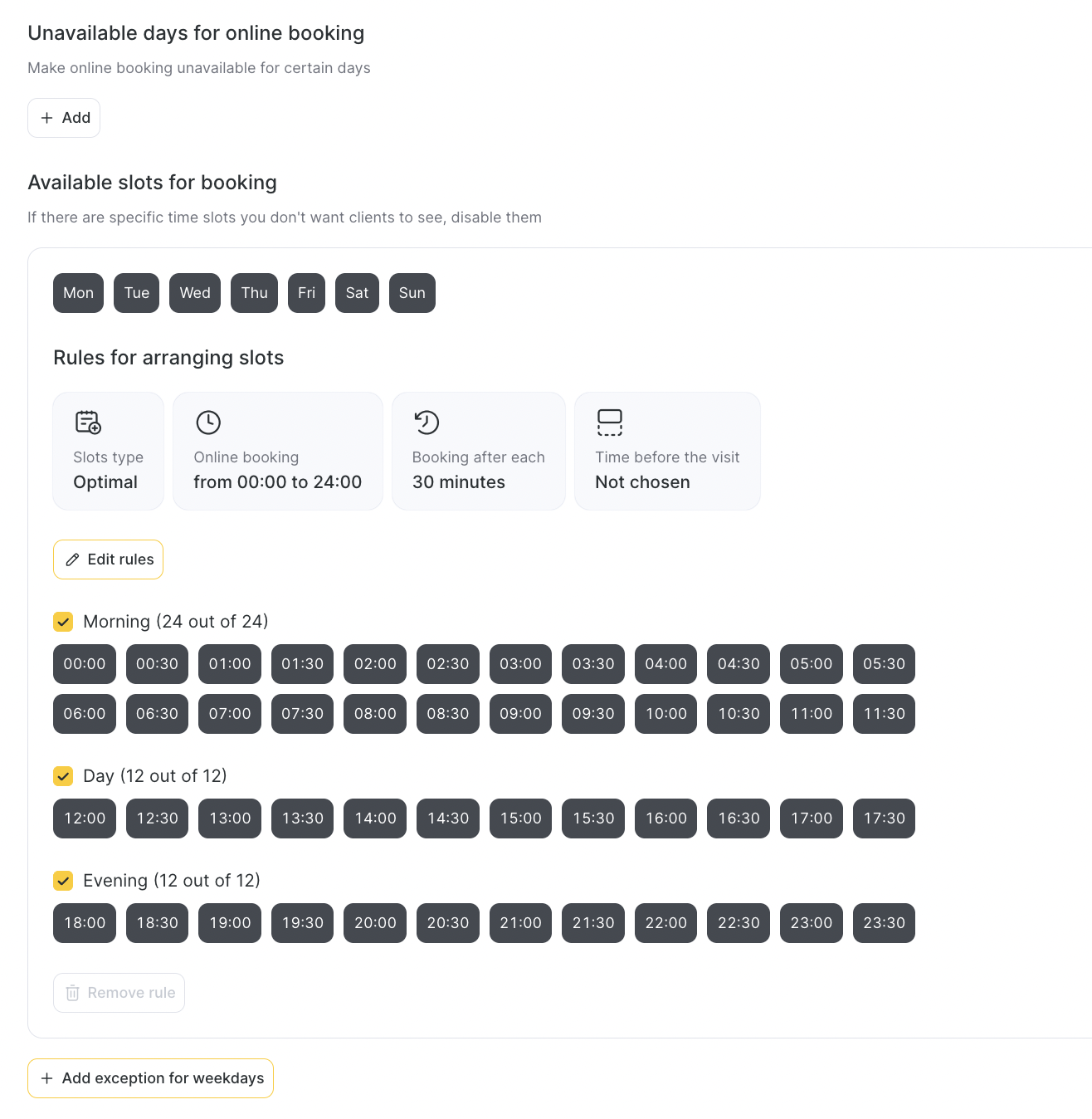 Exceptions: Add exceptions for specific weekdays or periods to temporarily change availability.