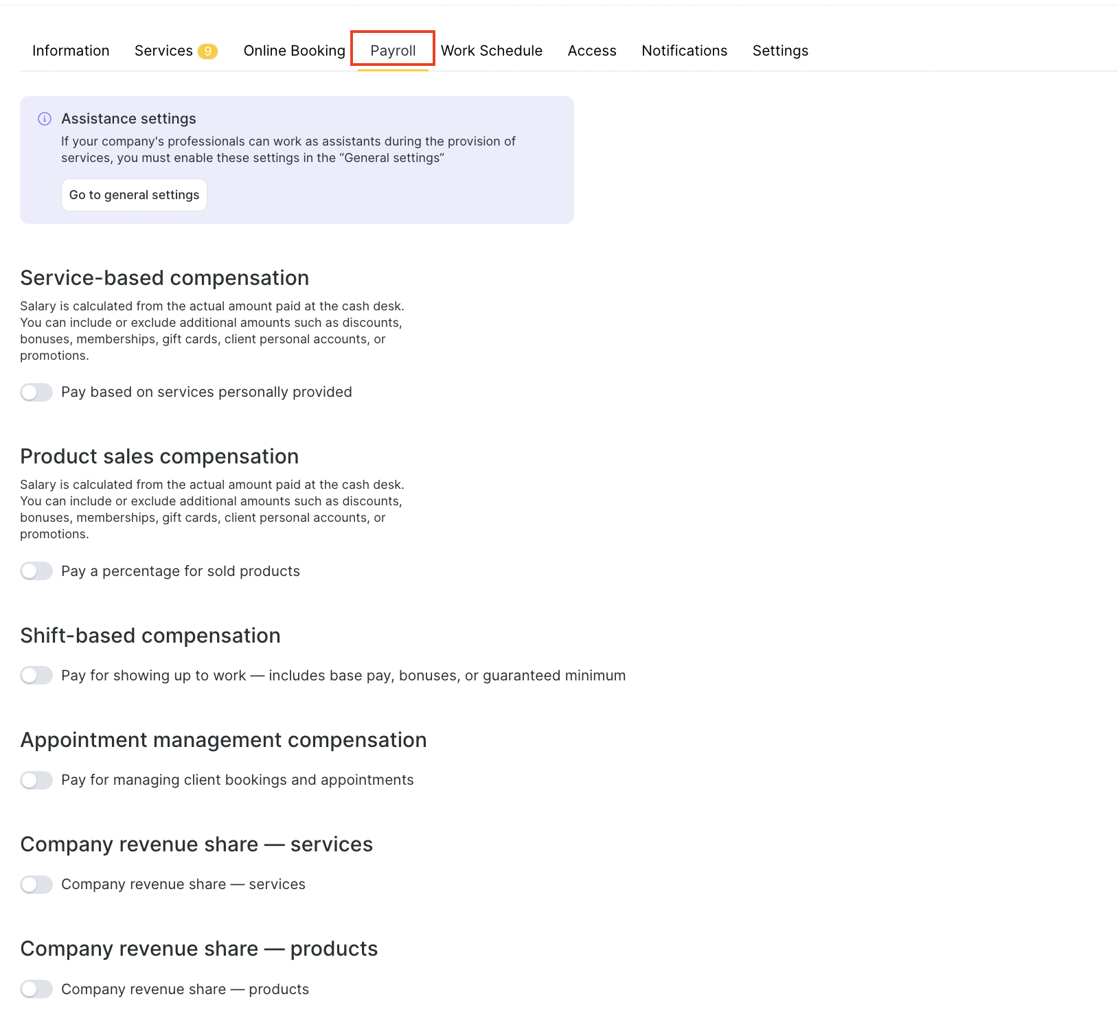 The Payroll tab allows you to set up how each team member is compensated for their work. This is where you define which types of payments or commissions apply to a specific team member, from service-based earnings to product sales and shift-based pay.
