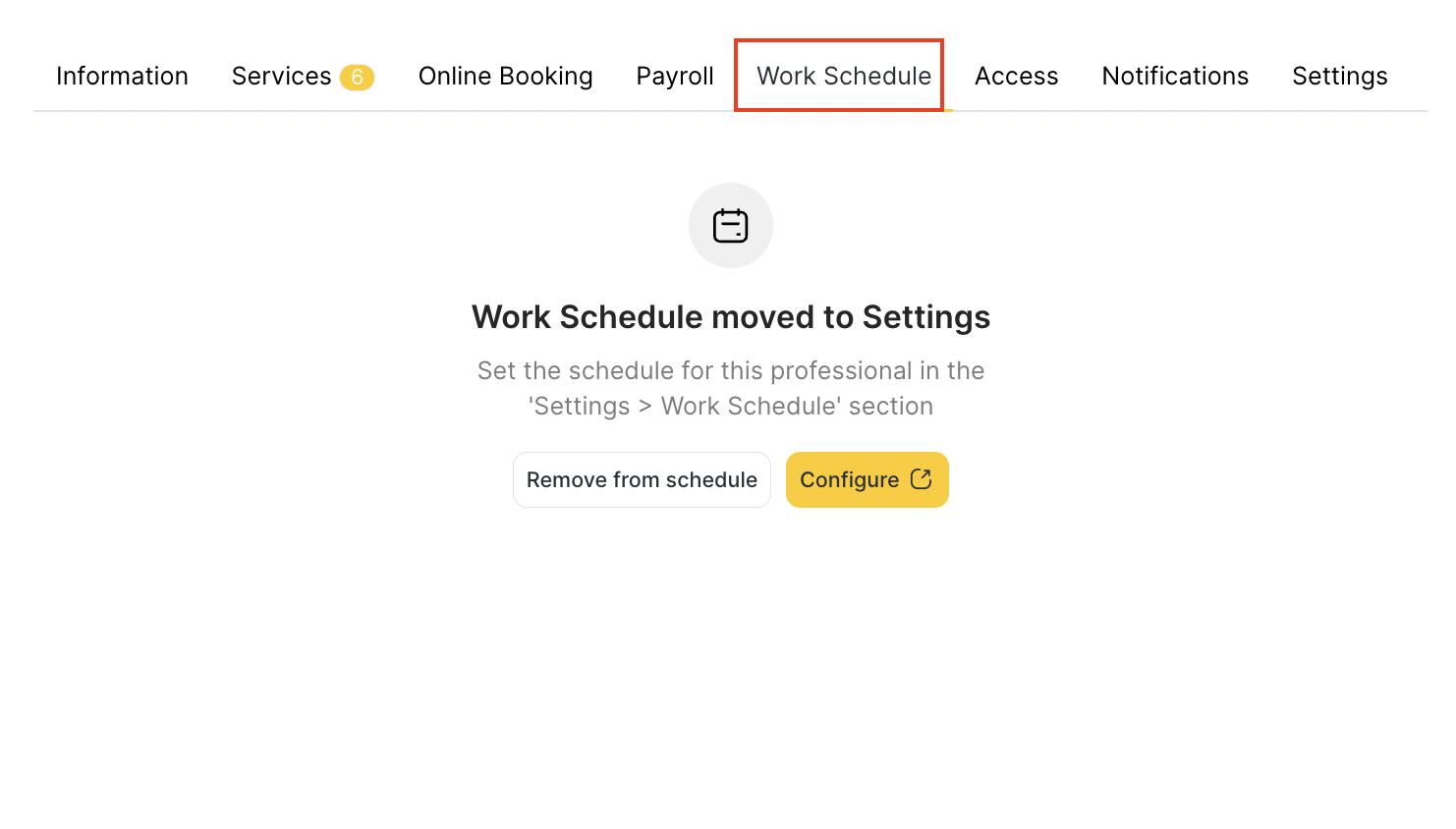 Click Remove from schedule to detach the professional from their assigned work schedule (a confirmation message will appear).