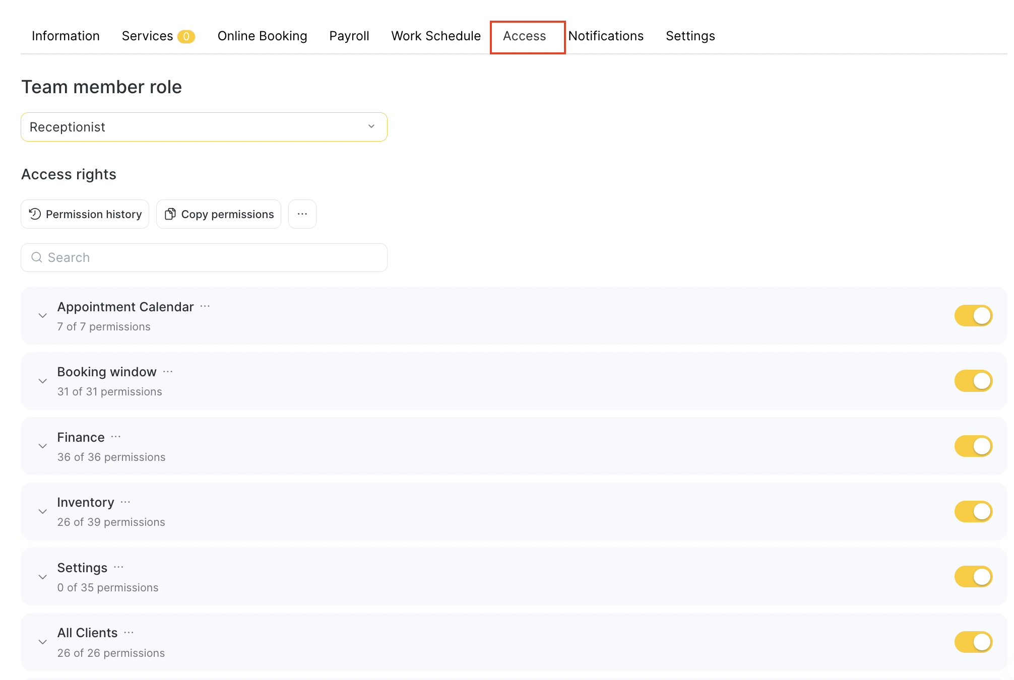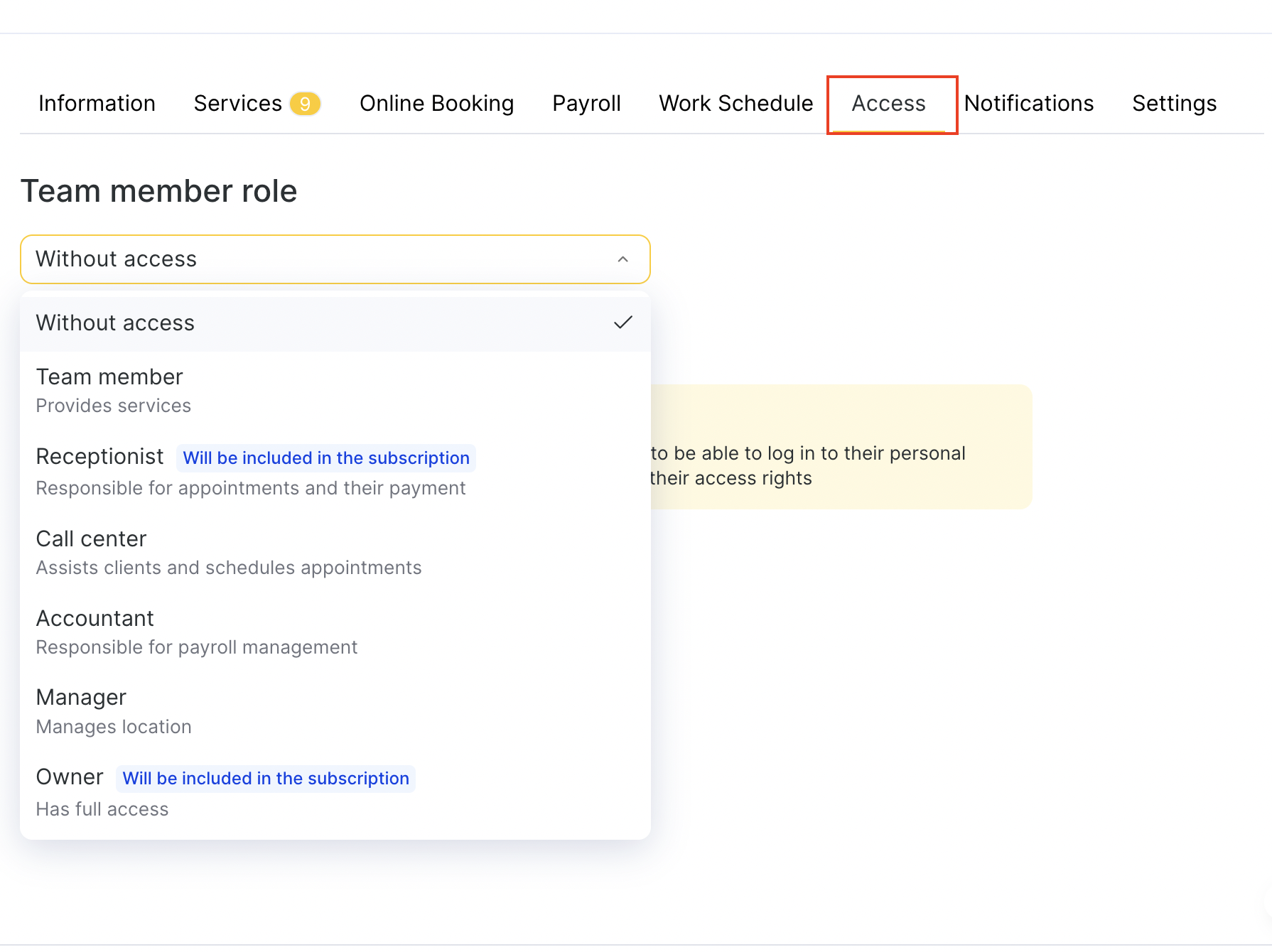 The Access tab allows you to define what each team member can do inside Altegio. This is where you assign roles, permissions, and login access to team members. The access level you choose also affects whether the team member counts toward your Altegio subscription billing.