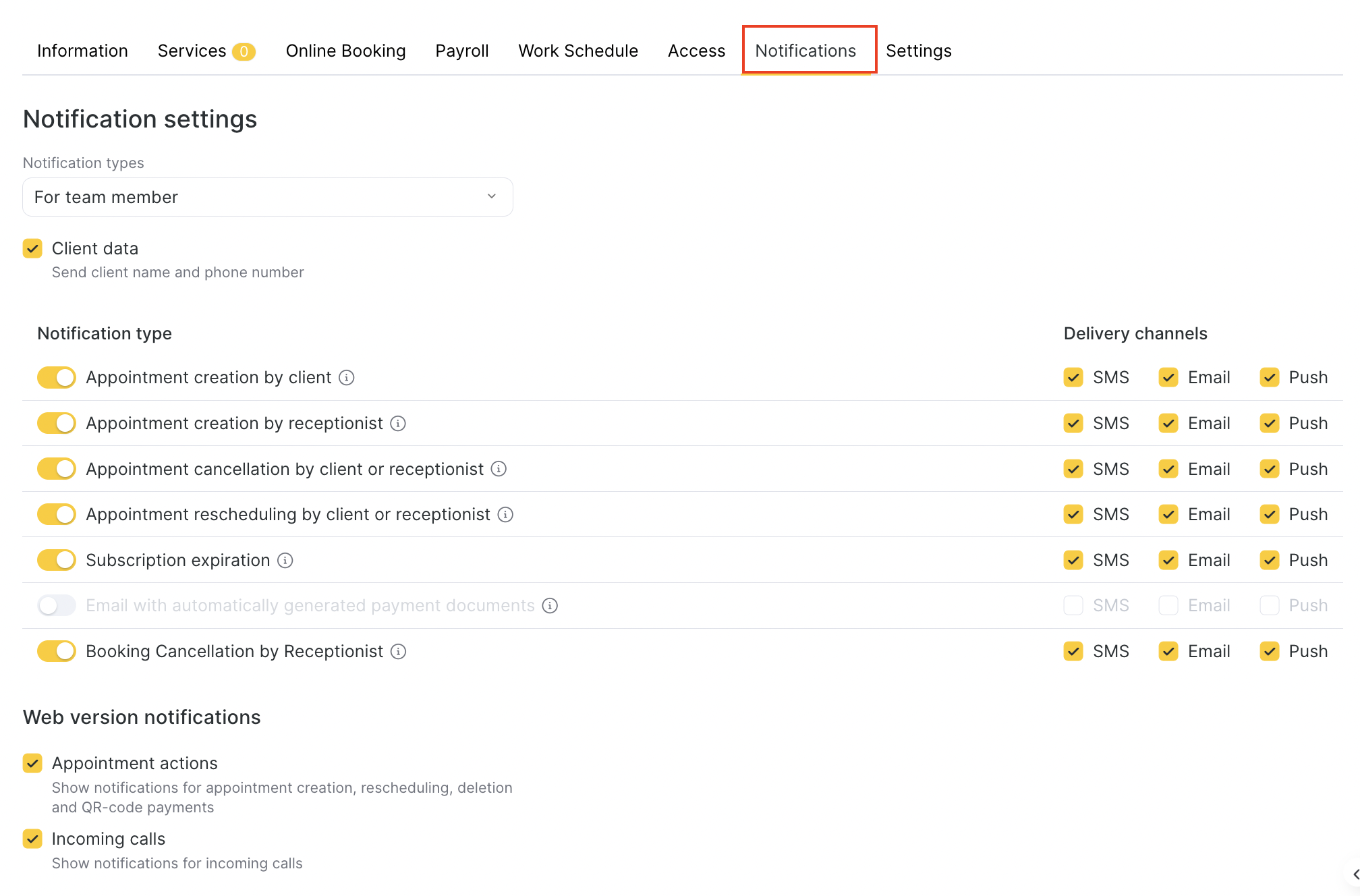 The Notifications tab in this section allows you to control how each team member receives alerts and updates about appointments, client actions, and other important events. This ensures your team stays informed and responsive at all times.