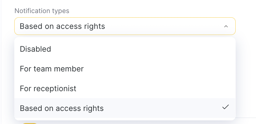Choose which events trigger notifications for the team member (e.g., appointment creation, cancellation, rescheduling, subscription expiration, booking cancellation by receptionist).