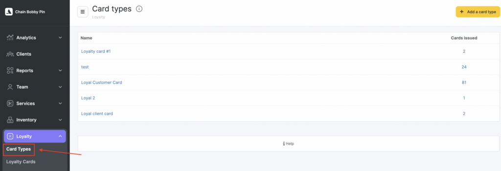 - In the Altegio chain interface, go to the Loyalty section > Card Types.