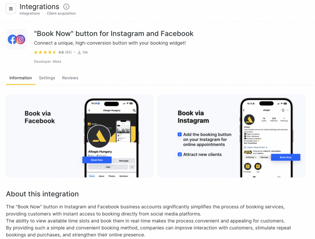 This guide will help you connect your Instagram and Facebook accounts to Altegio enabling the “Book Now” button on your social media profiles. Follow these steps to set up the integration: