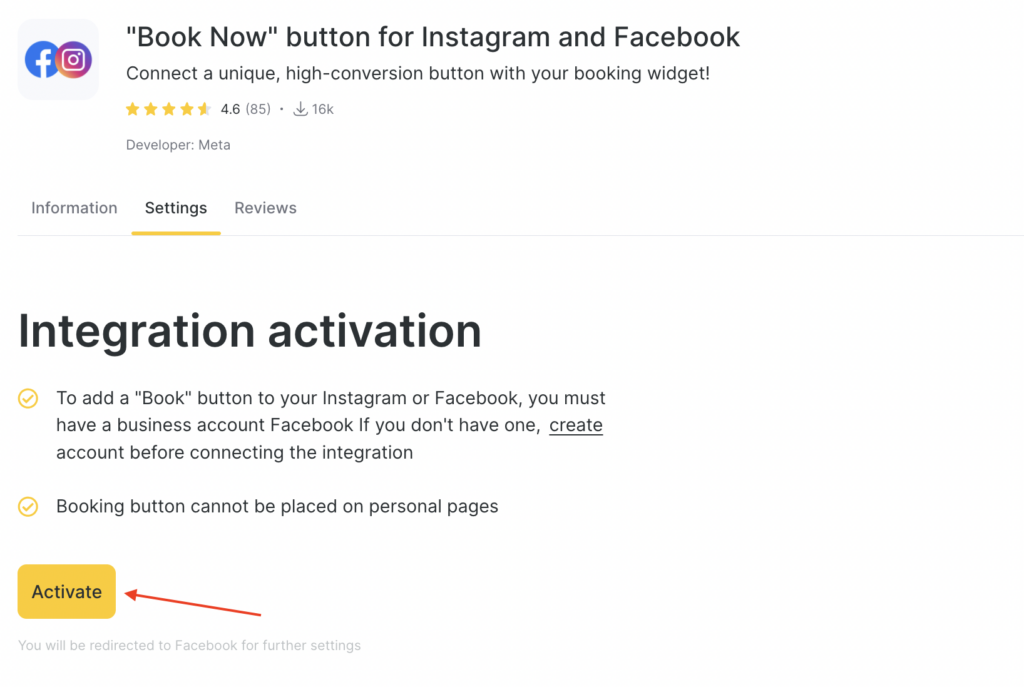 Booking button cannot be placed on personal pages. To add a “Book Now” button to your Instagram or Facebook, you must have a business account Facebook. If you don’t have one, create an account here before connecting this integration.