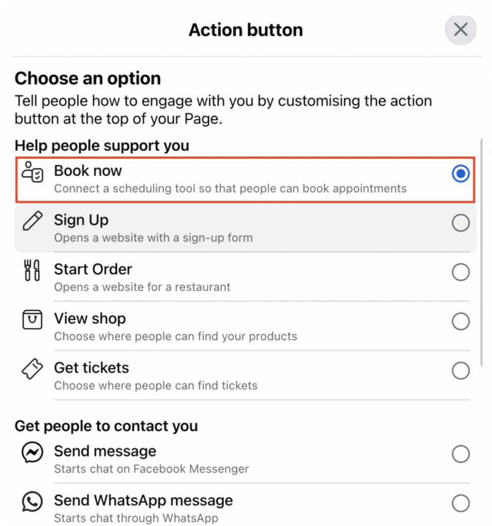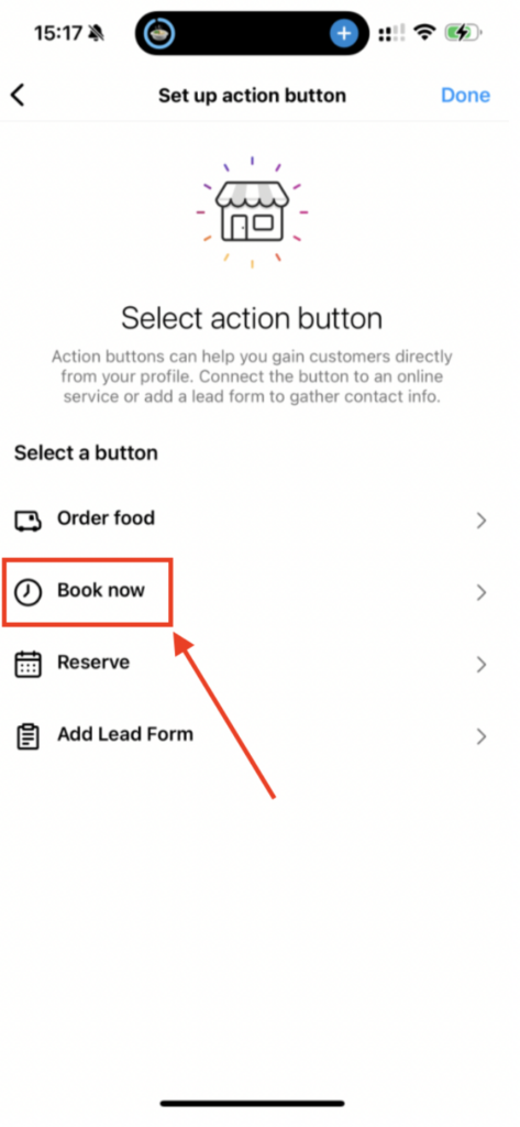You will be presented with options such as “Order food,” “Book now,” “Reserve,” and “Add lead form.” Select “Book now.”