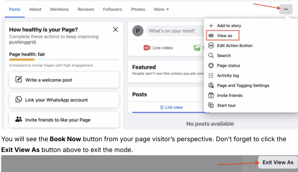 To see how the button looks on your Facebook page, go to the tree dotted menu on the right and select the View As mode.