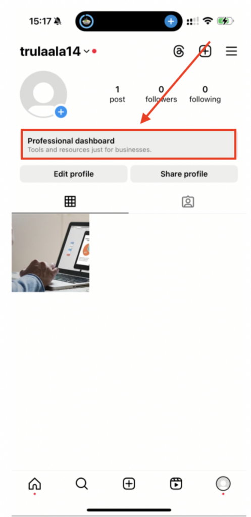 - Open Instagram and navigate to your profile. Access the “Professional dashboard” at the top of your profile page.