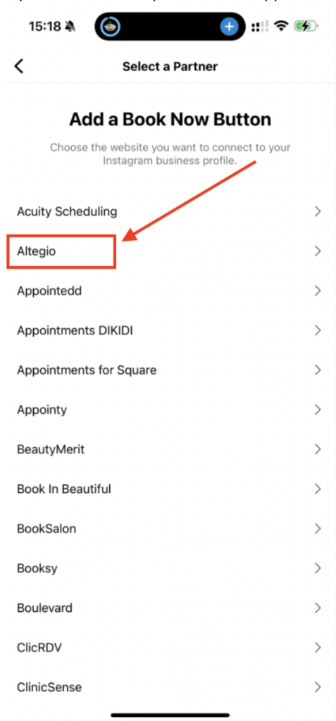 After selecting “Book now,” a list of service providers will appear. Look for Altegio in the list.