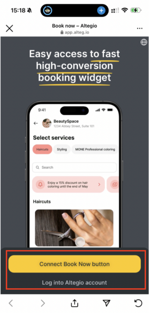 Click on Altegio to proceed. Choose between “Connect Book Now button” or “Login into Altegio account” options based on your login status at the time.