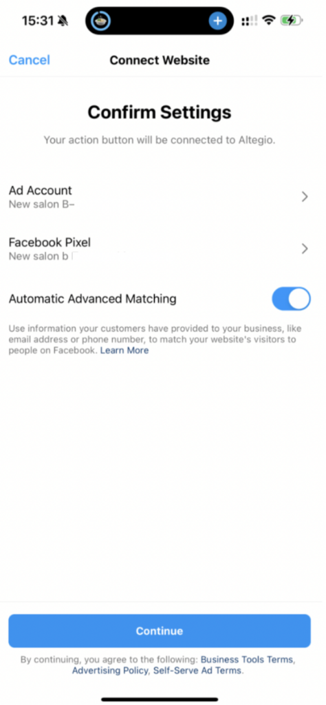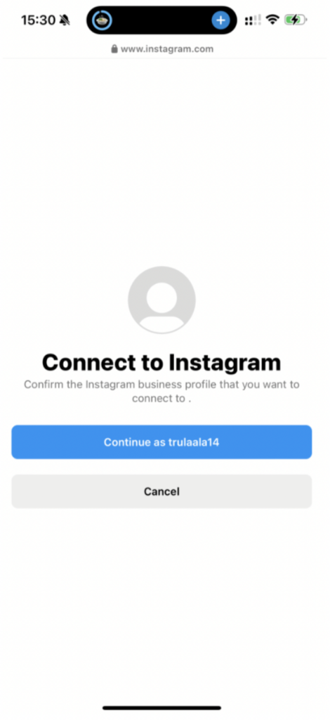 Press the Continue button below. The system will now connect Altegio to your Instagram profile. This process may take a few moments, so please be patient.