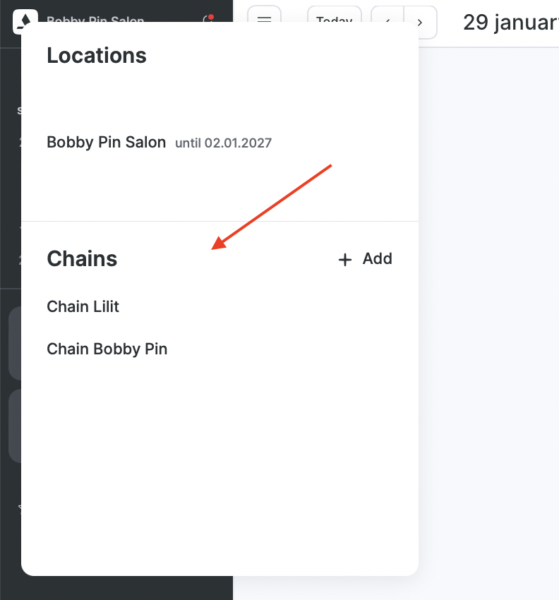 Altegio has 2 types of spaces: locations and chains. In the location, the menu sections on the left are highlighted in yellow, while chains are marked in purple color. Locations and chains have different sections.