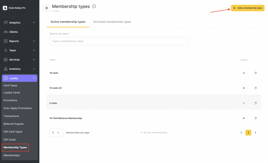 Navigate to the Loyalty section within the chain interface and select Membership types to open the membership creation interface.
