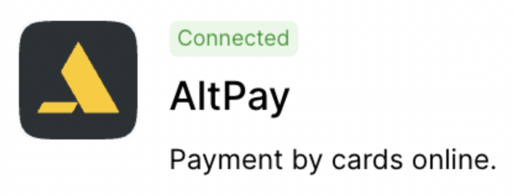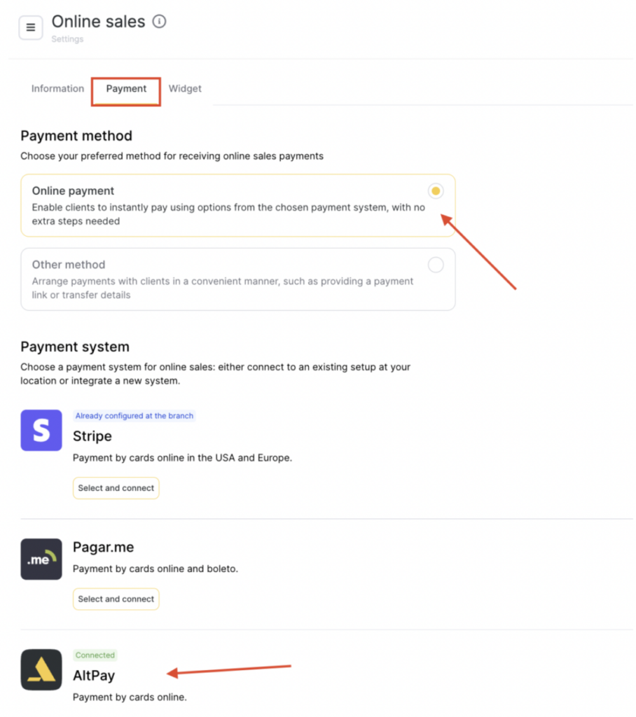 Choose the Online payment option and locate the AltPay payment method below. Click the “Select and connect” button.